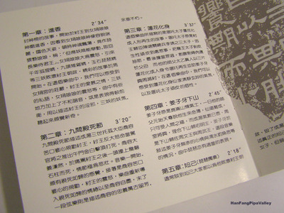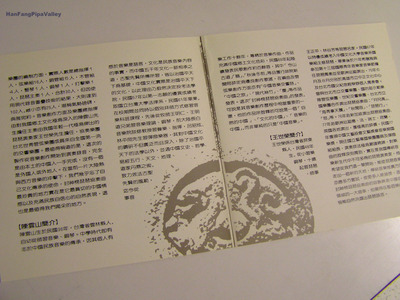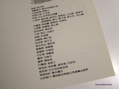 SCREAMING!!!Oh My~謝謝 好棒的感覺喔!!!其實我後來已經有收了改版後的CD,是1999年香港明達音樂代理發行的兩張合為一張,但是不管是包裝還是質感,還是BOOKLET,都不及舊版的經典最近在跟不景氣奮戰中,希望能持續有工作,才能繼續學琵琶你的新頭像還真可愛耶!!!