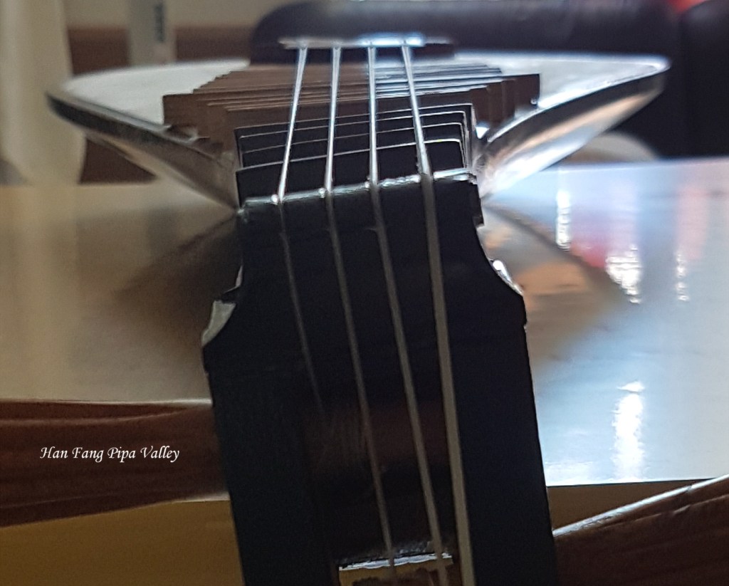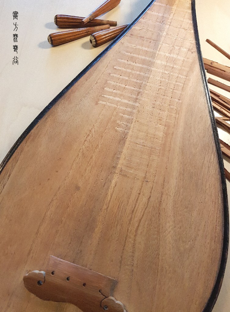 我知排品是高度精密講究數據準確的工序,非我這門外漢只憑肉眼感覺可勝任,而且新買的品預鬆了尺寸,須細加琢磨方合用,要磨好排好二十四品,實在太辛苦太難,且家中已有好幾個六相二十四品琵琶,沒必要再多一個。於是把心一橫,想到何不將此琵琶復歸傳統, 彈奏傳統樂曲四相十三品已足夠有餘,用六相二十四品琵琶反覺多餘礙事。於是我只排了十三品就完工。