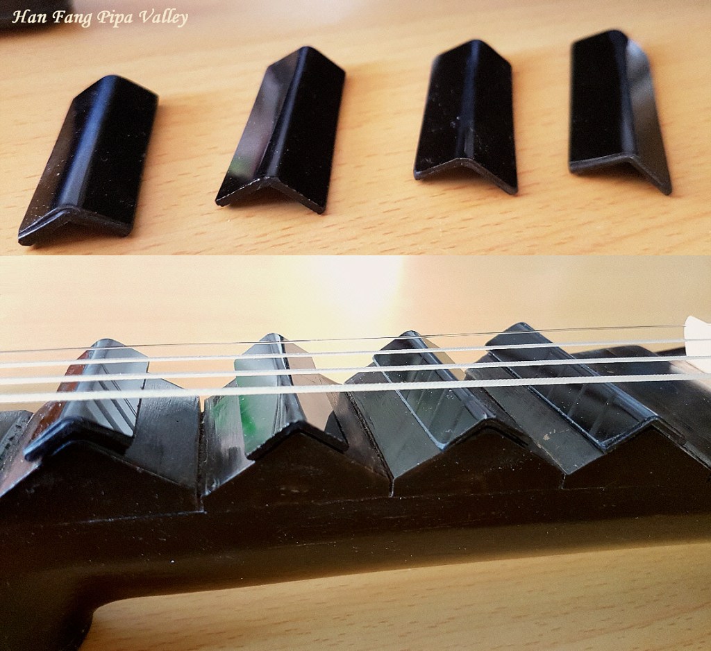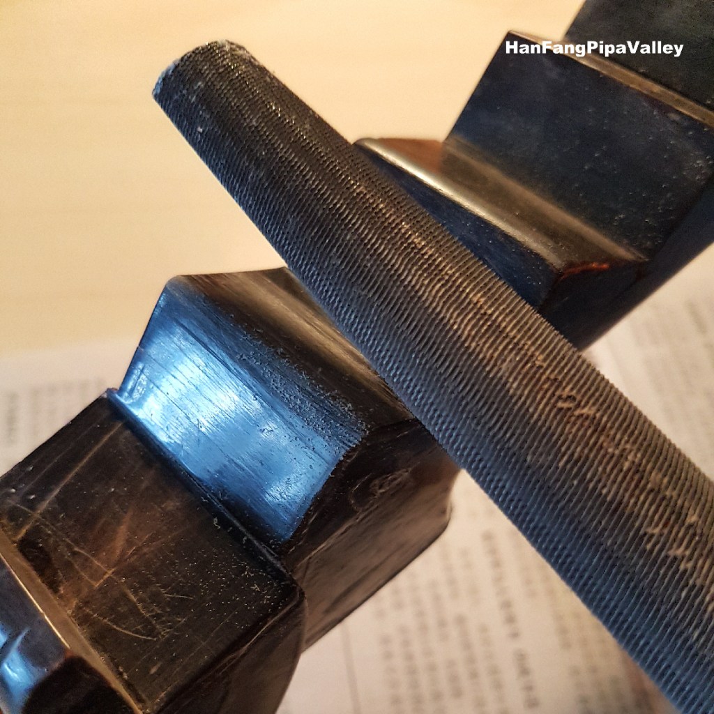 至於相,不需六個,可把一相和六相去掉,改成四相十三品傳統制式。此琴板面、背板、品、軫子所用材料均屬普通檔次,是入門級琵琶,但其相則選用黑牛角而非廉價之「膠木」,頗為奇特。我手上無新的相可替換,又想保留原來之黑牛角相,於是用鋼銼把第一和第六相銼平,使之變成天牌和地牌。