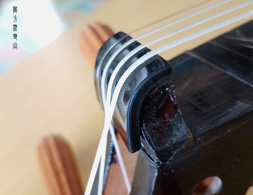 二至五相高度極接近,差不多所有音位均煞弦,如何是好?於是想出一個離經叛道之法,就是在相上按其拱度度身量製黑色亞加力膠片和膠墊調整高度,消除煞音。