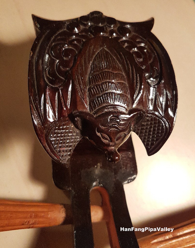 印象中六七十年代琵琶流行的「頭款」是「蝙蝠頭」。「蝙蝠」在中國傳統文化中寓意「福」,包含「福」字的吉祥話往往以「蝙蝠」形象圖象化,例如「五福臨門」就畫五隻蝙蝠。我於七十年代中學習琵琶,教室設於學校的中國音樂資料館內,館中有六七把入門級琵琶供教學之用,彈魚絲弦或絲弦,大部分都是蝙蝠頭琵琶。當年對此頭款沒甚留意,如今浮誇的「大花頭」成行成市,要找一把蝙蝠頭不容易,方覺其純樸厚實,古趣盎然。