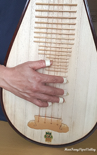用琵琶「能」續彈《宮苑春思》第18至33小節,共16小節。子弦是敦煌型鋼絲裸弦,中老纏三弦都是鋼繩尼龍弦,指甲是透明的「特級賽璐璐指甲」。我曾在本谷介紹這款指甲,見這裏: