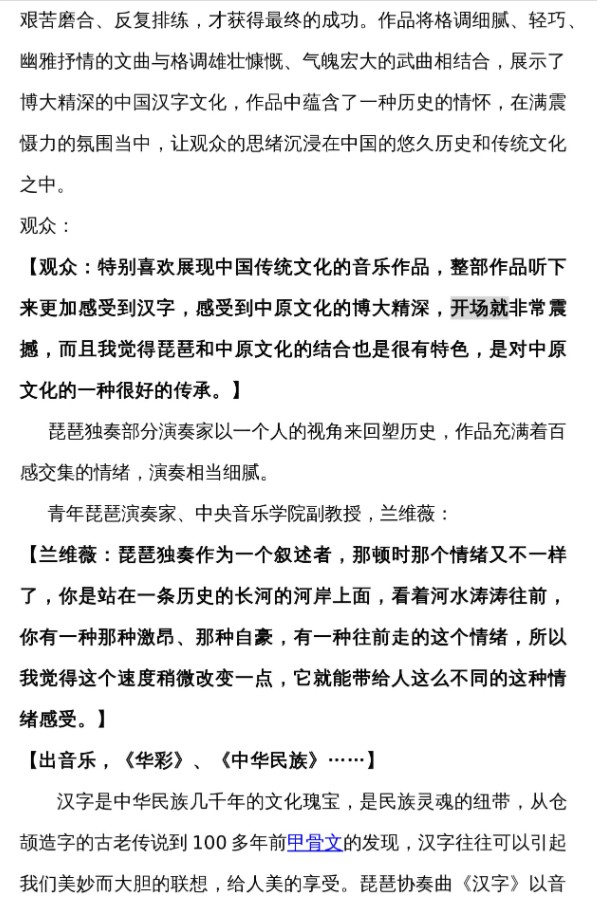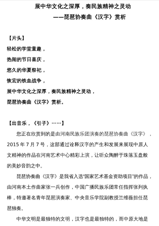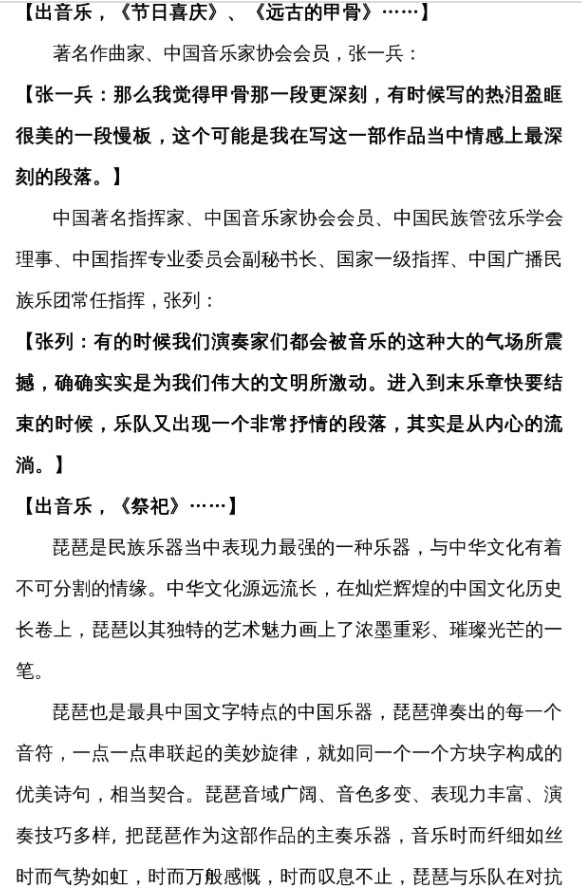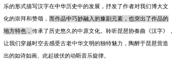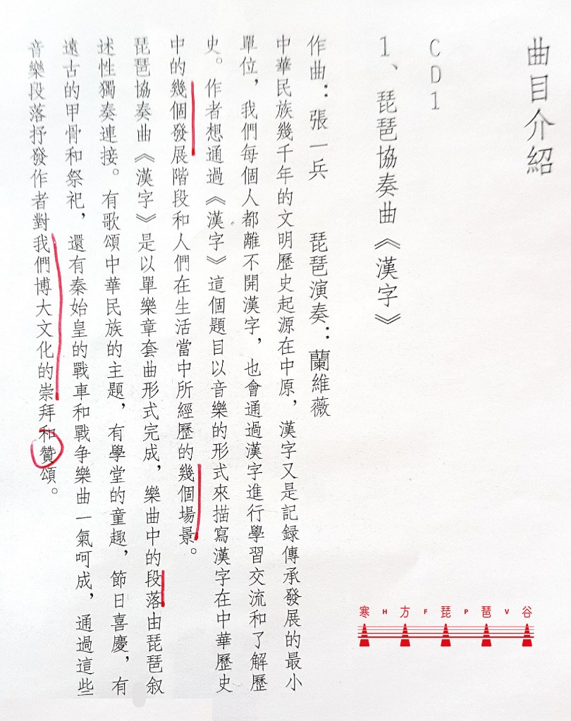 曲目介紹是引領聽者進入、欣賞樂曲——特別是新樂曲——的重要橋樑。但很可惜《漢字》這段曲目介紹,我認為是整套專輯中最空泛、最無組織、最失焦的一則,以下舉出理據:一、介紹的首兩行用了全文四分一的篇幅指出中華文明起源地和漢字的重要作用,這只是在陳述一般事實和常識,並未進入具體的介紹本身。二、針對此曲的介紹是在第三行才開始的,就是「作者想通過《漢字》這個題目以音樂的形式來描寫漢字在中華歷史中的幾個發展階段和人們在生活當中所經歷的幾個場景」。只看這句,作者的目的似乎有兩個:一個是「以音樂的形式來描寫漢字在中華歷史中的幾個發展階段」,但問題是,「幾個發展階段」指的是哪幾個發展階段?這是必須介紹的重要內容,卻語焉不詳(後文提到的「遠古的甲骨」可能是第一階段)。另一個目的似是「以音樂的形式來描寫人們在生活當中所經歷的幾個場景」,同樣,「幾個場景」指哪幾個場景?更令人摸不著頭腦的是「人們在生活當中所經歷的幾個場景」跟「漢字」和以《漢字》為題的這首琵琶協奏曲有甚麼關係?三、第二段說「樂曲中的段落由琵琶叙述性獨奏連接」,樂曲中共有幾多個段落?是否就是上面所說的「幾個發展階段」和「幾個場景」,讀者不得而知。介紹只在後面用「有……有……有……還有」這種非窮盡的句式以四個「有」卻列出七種內容,即:1 歌頌中華民族的主題,2 學堂的童趣,3 節日喜慶, 4 遠古的甲骨,5 祭祀,6 秦始皇的戰車, 7 戰爭樂曲。當中除了第4項遠古的甲骨應是「漢字」的「起源階段」外,其餘各項跟「漢字」有何關係?2 學堂的童趣要說的是學習漢字的情景嗎?何以會納入樂曲中而「一氣呵成」?四、介紹最後說「通過這些音樂段落抒發作者對我們博大文化的崇拜和贊(讚)頌」,如果全曲由琵琶叙述性獨奏連接的「音樂段落」旨在「抒發……對我們博大文化的崇拜和讚頌」,那麼此曲應題為《中華文化》,又何必以《漢字》為題?文化與文字是兩個不同概念,中華文化與漢字都是兩個不同概念。文字是文化的記錄、載體,但文字不等同文化。將文字同文化混為一談有混淆概念之嫌呢。