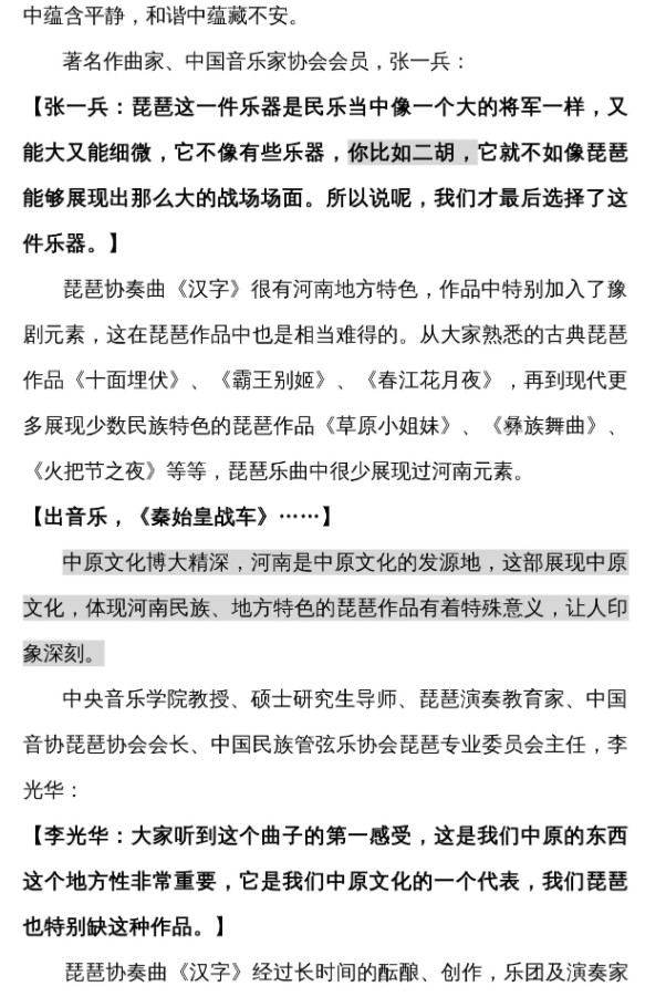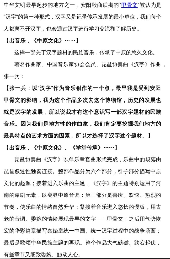 寒方補記:《漢字》琵琶協奏曲是張一兵先生創作「彈撥三部曲」的第一部,第二部是《瓷器》中阮協奏曲,第三部是《絲綢》古箏協奏曲。張先生在《阮音瓷韻 彈撥中華——中阮協奏曲〈瓷器〉創作談》一文中說:「《瓷器》是我的彈撥三部曲的第二部,前一部琵琶協奏曲《漢字》創作於2013年,第三部古箏協奏曲《絲綢》正在創作中。漢字、瓷器、絲綢都是中國人生活中最熟悉的文化載體,琵琶、中阮、古箏以點狀的發音和意藴悠遠的左手行韻形成最具特色的音樂語言,選擇這三件彈撥樂來分別對最具代表性的華夏文化符號展開音樂想象,出於我對這三件樂器的偏愛,更是出於我對中華傳統文化表達崇拜和讚頌的心願。」(見微文庫《音樂週報》2018年4月3日,網址(2020年12月22日截取):https://www.luoow.com/dc_hk/106407228