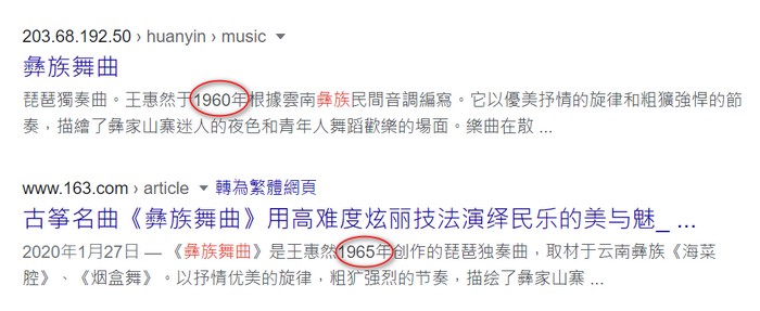 在此附帶一提:關於《彝族舞曲》的創作年份,網上有兩說,一說是作於1965年,一說是作於1960年。如: