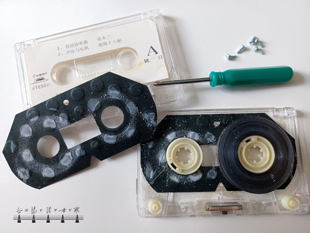 用舊錄音機把磁帶捲到結尾,霉粉四散,幸好磁帶尚能捲動,並未受潮至黏合變形。於是小心把卡式盒拆開,裏面情況是這樣: