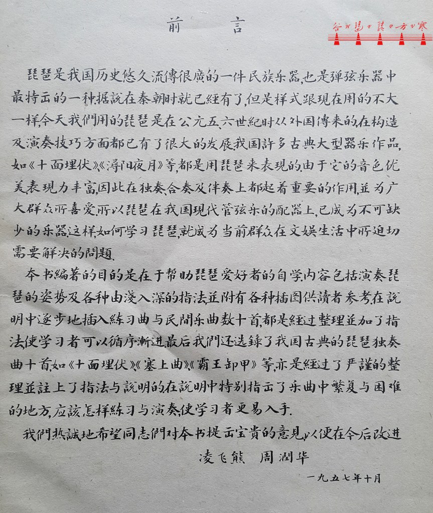 凌周版《怎樣彈琵琶》的北京原版是一個手寫本,全書的文字都是工整的毛筆楷書體,筆法細膩,字形美觀,執筆者應是一位功力匪淺的書家。最能見出其書藝之美的就是本書的前言,仔細觀摩,但覺字字一點一劃一勾一捺均輪廓分明,絕不苟且,令人讚賞: