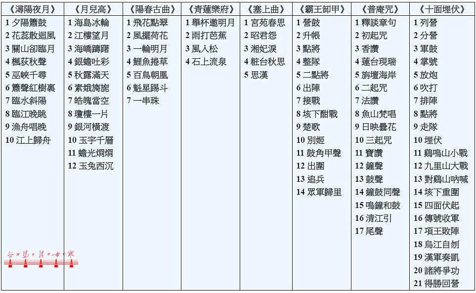 但此書在提供上述十首獨奏曲方面,有一點明顯不足之處,就是沒有具體寫明其譜本出處或依據,又或是否有屬於編者所作的修訂改動。這些傳統名曲都有不同流派的不同版本,究竟「凌周本」所提供的是哪個流派的版本呢?書中並沒說明。然而據資料顯示,此書極有可能是琵琶名家陳天樂先生早期編寫的教材,由其學生出版,而陳先生是汪派一代宗師汪昱庭的弟子,以此推論,書中各曲或屬汪派所傳。為了進一步求證,以下列出此書所收《潯陽夜月》、《月兒高》、《陽春古曲》、《青蓮樂府》、《塞上曲》、《霸王卸甲》、《普庵咒》、《十面埋伏》八曲的分段標題,大抵可得到一點解答問題的頭緒: