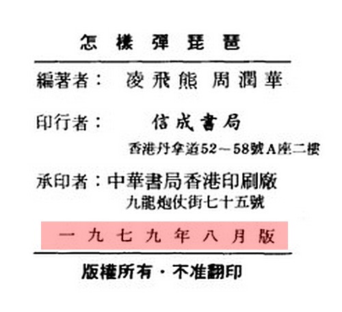 1. 多謝你留言。這個1979年的版權頁是在圖書館的網上閱覽版剪貼下來的,用以證明此書在1979年曾再版。我手上的一本出版於1974年1月,信成書局的地址就是香港寶馬道六十四號。1979年信成書局大抵已搬遷了吧。謝謝你提供資料,可證香港版《怎樣彈琵琶》曾在上世紀七十年代多次重印!