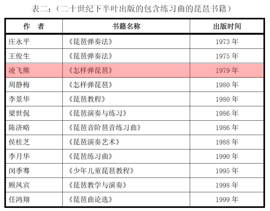 引錄自計鑫《林石城琵琶練習曲研究》吉林大學碩士論文2012,頁9。(寒方按:此表中1979年出版的《怎樣彈琵琶》的作者只列出凌飛熊一人,出版社名稱則從缺。)