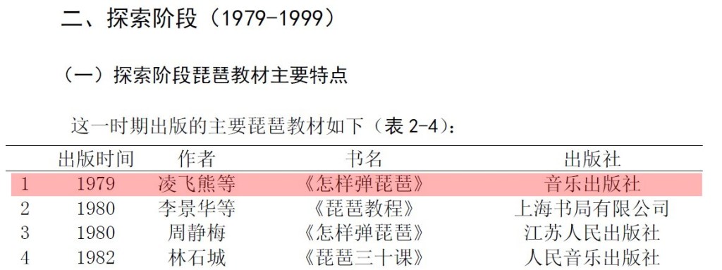 此表節引自馮彤彤《琵琶教材的發展沿革和建設研究》湖北師範大學碩士論文2017,頁8。