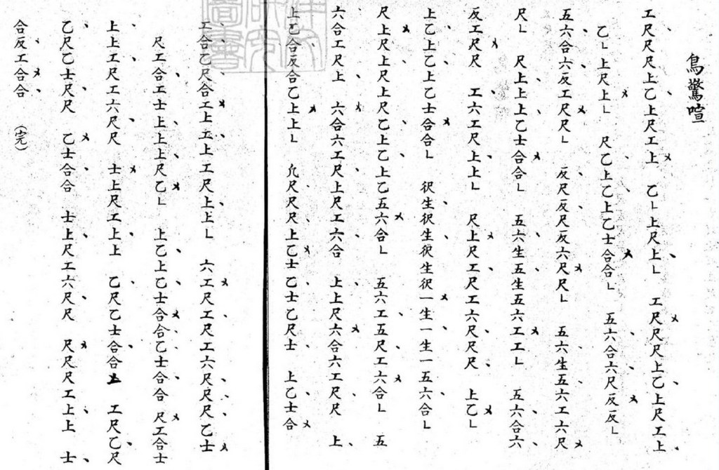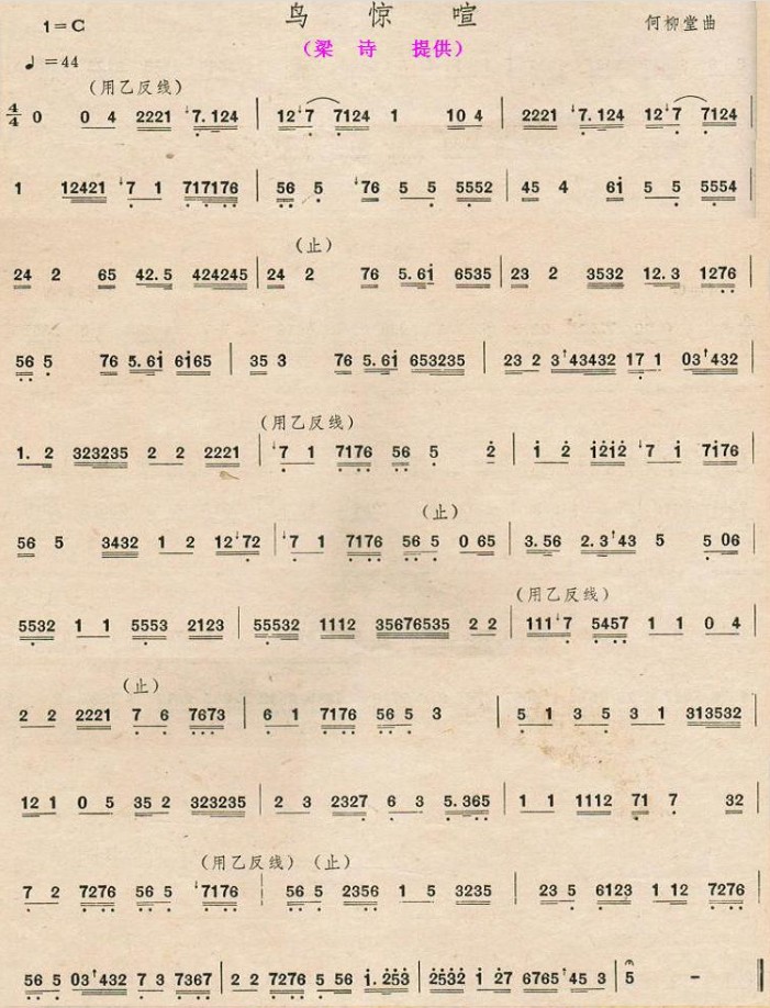 上兩次已據雙何《琵琶樂譜》彈奏了《餓馬搖鈴》和《雨打芭蕉》,這次《鳥驚喧》就不彈上面的主旋律工尺譜,改彈現今通行的版本。網上找到一個「乙反線」與「正線」梅花間竹交替彈奏的譜本,饒有趣味,現參考此譜稍加個人演繹試彈。(譜本來源:http://www.jianpu.cn/pu/24/245257.htm )
