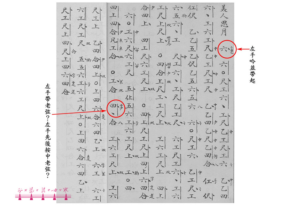 寒方見識不足,原譜中有些地方其實並不十分明白:例如全曲第一音,指法標識為吟、帶、起,我的理解是先彈5音左手吟,再帶起空子弦散音5(低八度),如此則共兩音,但譜中只標示一音;又如第二個紅圈所示之處,指法標識第一「字」書寫不清,似「帶」(帶起老弦)又似「中」(中弦老弦)。經摸索後我理解為先後按彈中、老弦,未知是否正確,但為求拋磚引玉,也就先據自己的理解去彈,當中錯漏之處在所難免。此外,因新弦張力未穩,加上琵琶蒙弦軸不夠緊及我曾自行重新排品關係,彈奏過程仍有音準問題,都請方家包涵指正。