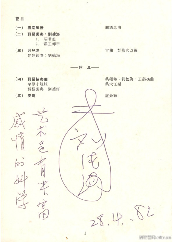 在此附上1982年4月28日音樂會場刊曲目一頁,有劉先生的題簽「藝術是有豐富感情的科學」。(原件見上述網站轉載周凡夫的文章)