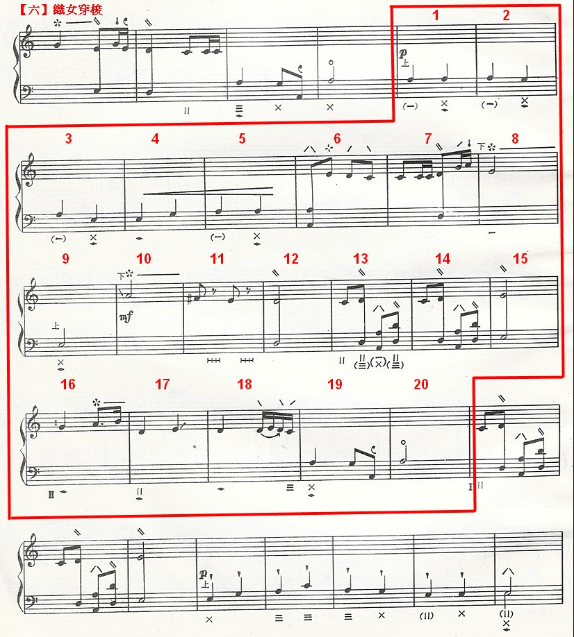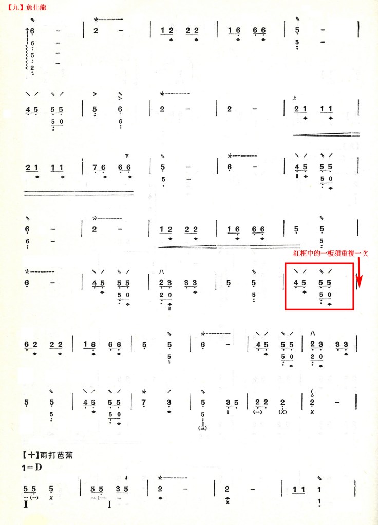第九段《魚化龍》何以只有六十七板,缺了一板?原來是簡譜編訂者漏掉須重複彈奏的一板,見下圖紅框所示。