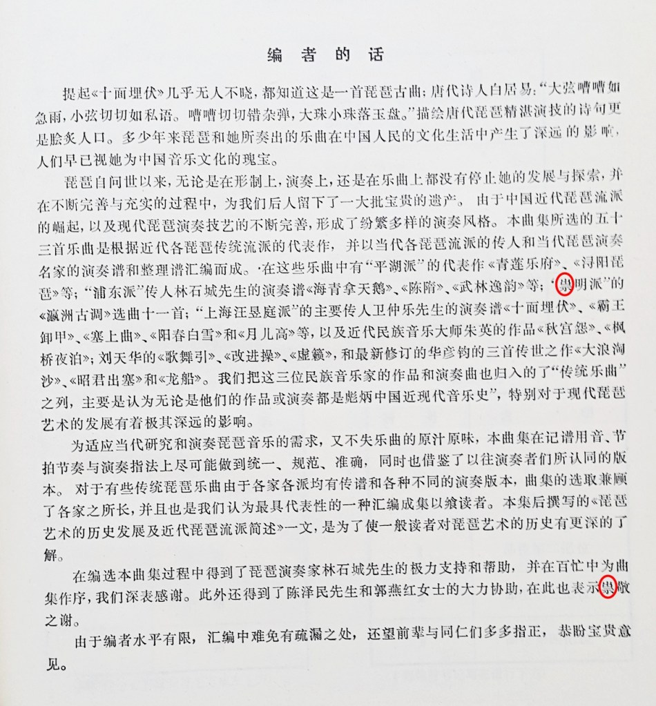 這本琵琶曲集還收錄了沈浩初傳譜、林石城整理的《海天拿天鵝》《陳隋》《夕陽簫鼓》《燈月交輝》四曲,也有其他琵琶流派的傳統樂曲。全書收曲五十三首。從上述一例的疏漏,似乎難免令人產生疑慮:未知其他樂曲的曲譜是否都有類似的缺失?我不知道事實怎樣,也無暇一一考訂。我也不知道當年為此書寫序的林石城先生有沒有發現這個問題,也不清楚此書是否出過修訂版,修補了上述的錯漏。