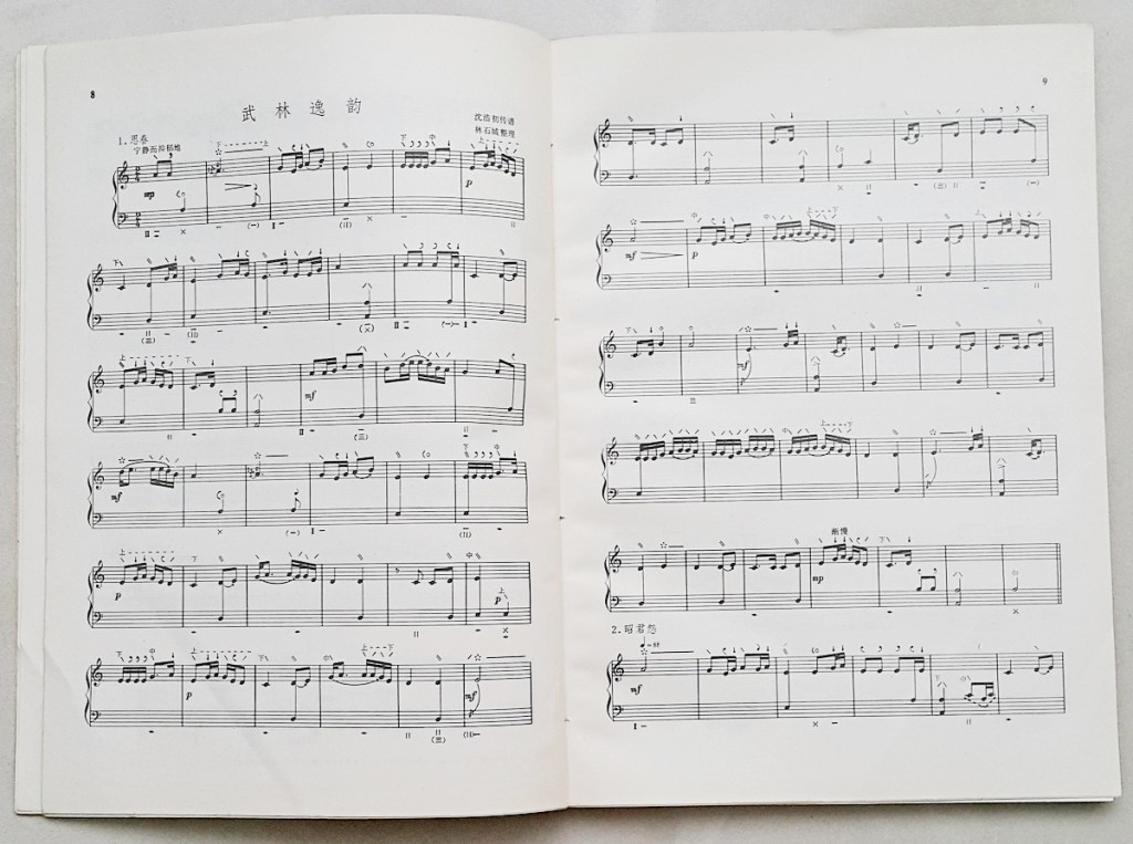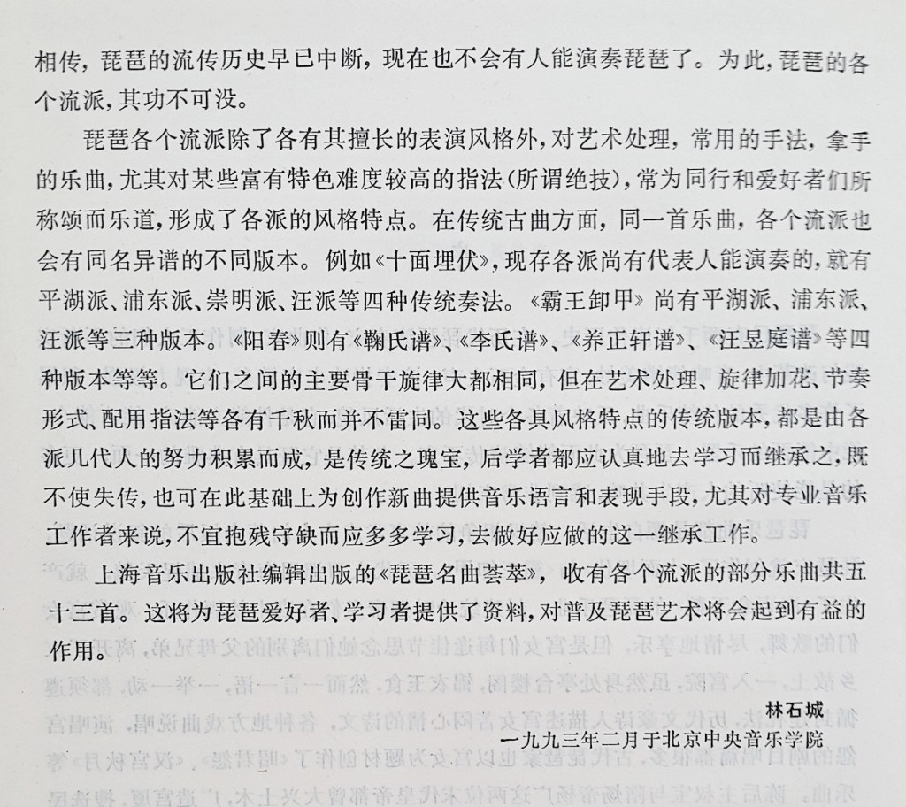 但個別曲目如《武林逸韻》的簡譜版本可以在其他不同的琵琶曲集中找到。現在談到的《武林逸韻》這個簡譜版,是收錄在上海音樂出版社1997年出版的《中國琵琶名曲薈萃》110-123頁。(見下圖左邊第一本。中間和右邊的「中冊」和「下冊」是在2007年出版的。) 這本《中國琵琶名曲薈萃》在認識、演奏和研究傳統琵琶樂曲方面,很有參考價值。(請參看下面所附林石城的〈序〉和本書〈編者的話〉的書影內容。)