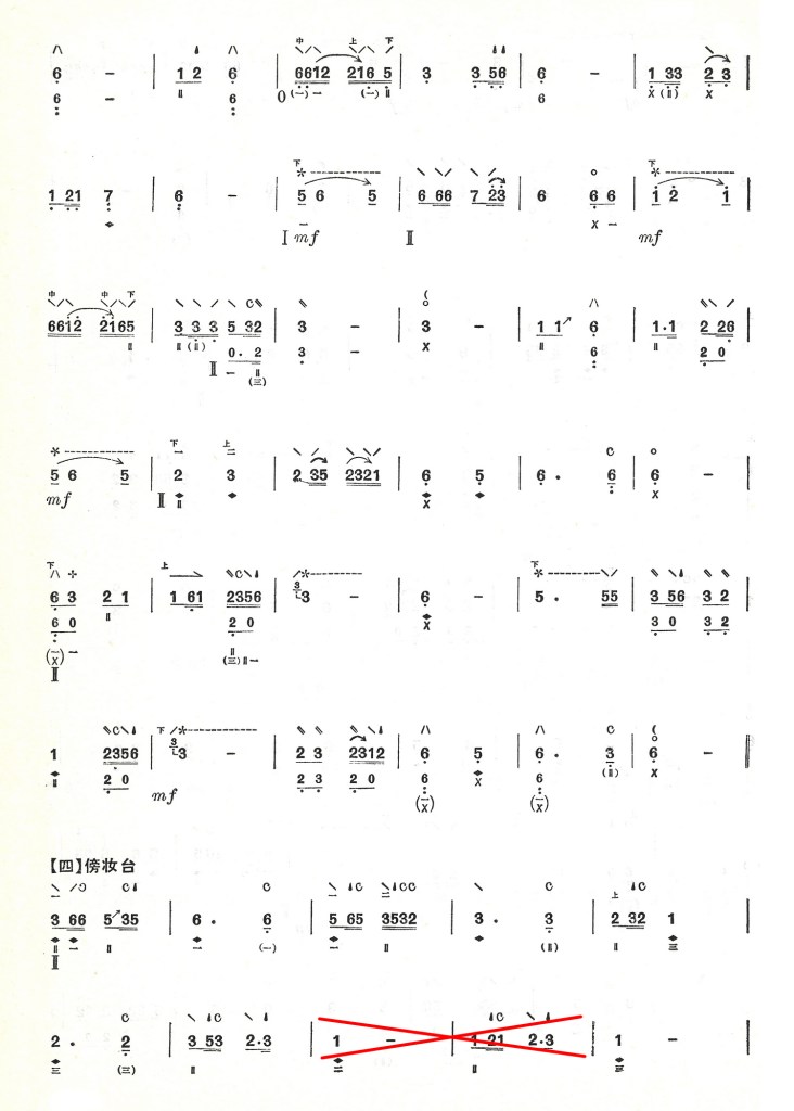 第四段《傍妝台》何以多出兩板?對照線譜版及林石城先生1956年演奏錄音之後,發現編訂簡譜者在下圖紅色標示處誤加了兩板,是原譜(線譜版)所無的。刪去後,第四段便還原為六十八板。