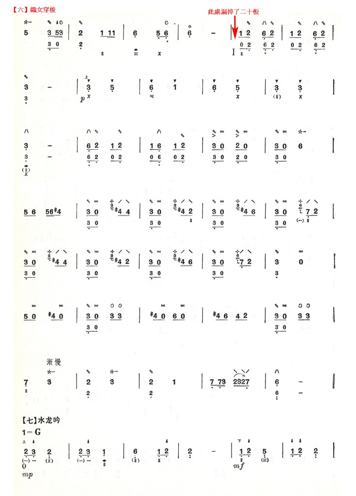 第六段《織女穿梭》何以只得四十八板?經對照後發現編訂簡譜者竟在下圖紅箭頭之處漏掉了二十板!