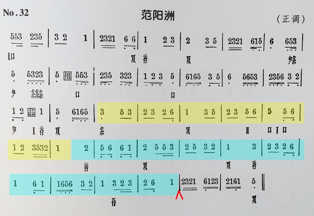 上圖簡譜譯本取自楊蔭瀏《雅音集》第二集(《楊蔭瀏全集》第七卷225頁)。譜中沒有加上背景色彩的部分,基本上都是依原譜照彈,黃色背景部分做了加花,每拍的頭音都用了原譜首音已用的扣彈指法,加強節奏並作呼應。藍色背景部分做了更細密的加花,節奏趨向全曲最後兩小節的十六分音型。這部分彈了兩次,用了不同的奏法。第一次每拍頭音運用空弦或低八度弦音加強音高的對比,營造輕快跌宕的效果;第二次則運用頭拍劃奏再加四指輪及其他節奏型劃奏以加強力度和氣氛,並在第二次結尾(上圖紅標)處增加了一小節,(11 1 11 1)把前面的1音延展至銜接最後兩小節完結。這些都是自己對樂曲的主觀理解和嘗試,不當之處,還望海涵、賜教!